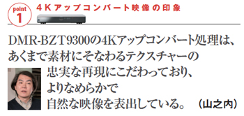 本機の画質からは映像表現の熟成を読み取ることができた。前作で達成した大きなステップアップを基盤に据えつつ、UniPhierの世代交代を利用してその先の領域に踏み込む。その前進によってこれまで見過ごしていた繊細なテクスチャーが浮かび上がり、遠近感と立体感の再現にも磨きがかかった。余分な演出を加えず、オリジナル素材の情報をそのまま引き出すことによって本来の緻密な質感を引き出すという基本思想は従来通りだが、本機は熟成と呼ぶにふさわしい確実な進化を遂げ、プレミアムモデルならではの余裕を読み取ることができた。