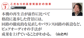 本機の再生音が前作に比べて格段に進歩した背景には、オーディオ回路の見直しやバランス回路の新設など、いくつかの理由がある。小澤征爾指揮水戸室内管弦楽団のディスクやOpusArteのオペラ作品など、BDの音楽タイトルを再生した時の並外れた静寂感やステージの深々とした遠近感は、UniPhierに組み込まれた「新インテリジェントローノイズシステム」の制御が進化し、HDMI以外のデジタル回路を遮断した成果である。さらに、ネットワーク音源やCDなど音楽専用メディアの再生時は使用しない回路の遮断をさらに徹底するため、再生音の純度はいっそう向上する。DLNA再生で音場の透明感や音像のリアリティが大きく向上したのは、不要ノイズの輻射を徹底して抑え込む手法をさらに洗練させたことが背景にあるのだ。