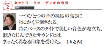 本機のアナログ出力はアンバランス端子、バランス端子いずれも重心の低い安定したバランスを実現したうえで、細部の情報を余すところなく再現する忠実度の高さをそなえている。声の音域は高音域にいたるまで余分な付帯音がなく、ソプラノやテノールの張りのある高音部が硬く突っ張る心配もない。CDもそうだが、特に本機で再生するネットワーク音源のサウンドは、BDレコーダーで聴いているという事実を忘れさせるようなピュアな質感を体感することができる。