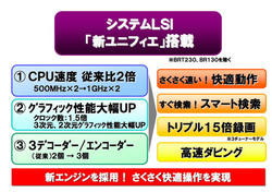 新DIGAの機能強化の秘密は、その頭脳部分にあります。パナソニックグループ内で設計開発された新しい「ユニフィエ」は、CPUを2基搭載(デュアルコア)、前モデルに比べCPU速度が2倍になり、グラフィック性能が大幅に向上しました。