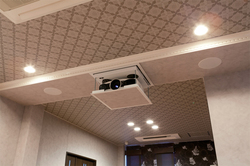 岡田さんが計画当初から導入を決めていた壁面収納「キュビオス」の導入と、高級感のある部屋の雰囲気を損ねないこと。この要望をうけて、タカシン電気の平沢靖章氏はビルトインシアターをインストールした。リアスピーカーは埋め込み、エプソンのプロジェクター「EH-TW8000」も昇降機を使って隠した。100インチのスクリーンは垂れ壁を設けて設置した。プロジェクターに関しては、昇降機を用いることと、スクリーンとの位置関係(スクリーンに比べてプロジェクターの設置位置が上方のため)により、サイズがコンパクトでレンズシフトの幅が広いモデルを選ぶことが大前提だった。その条件を満たすエプソンのEH-TW8000を平沢氏はセレクトした。