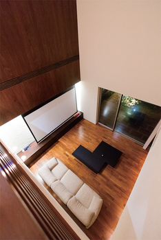 また、LDKと中庭の照明は、8つのゾーンに細かくわかれて調光できるので、ホームシアターだけでなく、ホームパーティや普段の食事など利用シーンにあわせて、照度をコントロールできる。操作も2種類ある壁スイッチを押すだけである。「水原さんのお店で体感したホームシアターは、映画館みたいで、映像に引き込まれる感動がありました。いま自宅にホームシアターができて、その時以上の感動があります。柔らかい光は豊かな気持ちにしてくれますね」と、奥様。