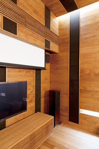 高い天井高、反射部と吸音部を交互に組み合わせた壁面構造。ここは知る人ぞ知る「石井式リスニングルーム」の設計が施されたホームシアターの専用室だ。オーナーの谷川さんは、音楽雑誌や住宅雑誌などをみて、ホームシアターをつくるなら、意匠的にも音的にも本格的な石井式のリスニングルームをつくりたいと思っていた。住宅の設計は、奥様もコンセプトに共感した杉浦英一建築設計事務所に依頼。話をすると、杉浦氏の事務所で石井式の空間づくりを手がけたこともあり、ホームシアター計画はトントン拍子に進んでいった。