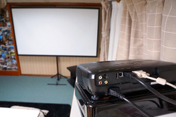 箱を開けてからの第一印象は「本体の軽さ」でした。測ってみると2.62kg(本体のみ)。片手で十分持つことができ、移動もしやすいです。付属品はリモコン、電源コード、スクリーンの4種類です。スクリーンには骨組みに番号が降ってあるので簡単に組み立てることができました。また、別売で3Dメガネも用意されています。