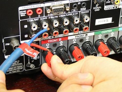 使用したスピーカーケーブルはオーディオ用の太いタイプ。端子が上下に並ぶAVアンプでは下側の端子にケーブルを差し込むのも、下側の端子を締めるのもかなり面倒だったが、横一列ならそのわずらわしさがない。プラスとマイナスの端子の間隔も適度に空いており、ケーブルが接触してショートすることも少ないはずだ