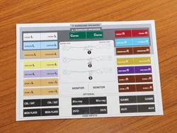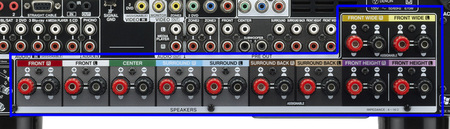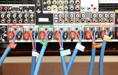 このシールを各チャンネルのケーブルに貼り、全7ch分を結線してみた。これは便利だ。L/Rを取り違えたり、サラウンドとサラウンドバックをつなぎ間違えたりすることはよくあるが、こうして「色」で照らし合わせれば、接続する先を間違えようがない。