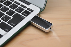 本体サイズはまさに一般的なスティックタイプのUSBメモリーと同じ。質量も約15.5gとコンパクト。外装側面にはアルミの押し出し材を使い、光沢感のあるブラックの樹脂製パーツとのコンビはとても上品なデザインに仕上がっている。