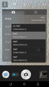フルに活かせる8メガピクセルの解像度で記録される設定になっているので、20メガ(画角は4対3固定)の写真を撮りたい場合はモードを「マニュアル」に変更する。マニュアルモードではHDRのオン/オフやISO感度、フォーカスモード、露出補正やホワイトバランスなどの設定が任意に選べる。