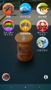 「AR effect」アプリは、モニター上に7種類のテーマから選べる画像を表示して、被写体と一緒に撮影できるエフェクト機能。実風景の写真の中で恐竜が暴れ回ったり、海の中で熱帯魚が泳ぎ回る写真などが撮影できる。