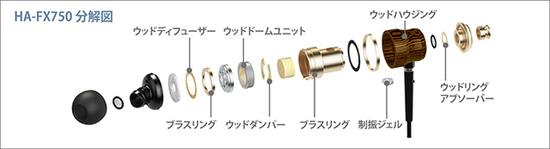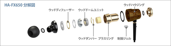 最後に、末弟の「HA-FX650」はというと、こちらは「HP-FX500」と同じ8.5mm口径のドライバーユニットを搭載。口径が一番小さいため、ハウジング部も一番小口径となり、装着感についてはシリーズ中もっとも軽快となる。また、基本的なパーツ構成は上位モデルと変わらないものの、フロント側のブラスリングやハウジング後端のウッドリングアブソーバーなどが省略されている。ケーブルは「HA-FX750」と同様に直出しだ。