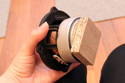 そして製品の顔であるスピーカー。核心技術である木製振動板「ウッドコーン」に加えて、キャビネットの材質や設計も見事。箱はアルダーとチェリーの無垢材で、チェリーの響棒、ドライバー背面のウッドブロック等でチューニングを詰めている。バスレフポートの周囲のフェルトのリングも細かな音質調整のひとつだろう。