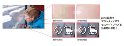 今回から搭載された新技術としては「デジタル放送ノイズエリア解析超解像技術」がある。これは、4Kテレビの大画面でデジタル放送を視聴した際に目立ってしまうノイズを軽減するというもの。映像のエッジ部や平坦部の特徴を詳細に検出し、エリアごとの映像処理によってノイズを軽減。画面全体の鮮明さと文字のクリアさを実現するのだ。
