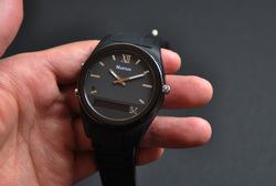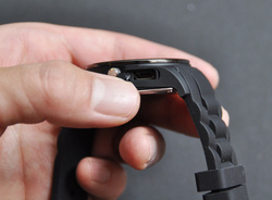 本体の左右側面にはボタンが配置されている。右側のボタンは普通の腕時計と同じように時刻を合わせるためのもので、スマートウォッチ機能の操作には左側上下のボタンを使う。