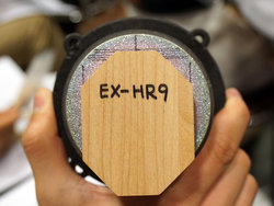 EX-HR9のフルレンジドライバーの振動板では表側に十字に貼られているチェリーの薄板「異方性振動板」は、EX-HR7のウーファーの裏側にも同じように貼られている。磁気回路後部に設置される音響パーツ「八角形ウッドブロック」も、メイプルとチェリーと木種は異なるが、同様に装備。