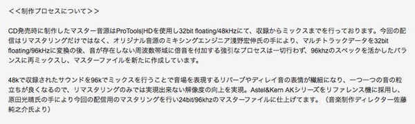 実例としては、ランティスが発売しているアニメ「ラブライブ」関連楽曲の一部は、48kHz/32bitで録音し、ハイレゾ配信向け音源の制作時にはミックスとマスタリングを96kHz/32bitで行い、そして96kHz/24bitで配信していることが、その意図(効果)と共に明示されている。なおもちろん、録音時点からより上位のフォーマットにしておくことができればそれがベストだ。ではなぜそうはせずにこのような手法を採るのか。