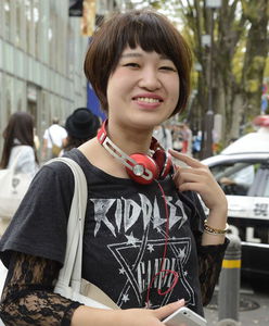バンドT、穴あきデニムのショートパンツ、ちょっとデコラティブなラバーソウル。ロックテイストあふれるスタイリングで表参道を闊歩していたさわこさん。お話を聞くと、ふだんからロックを聴いているのだそう。