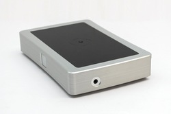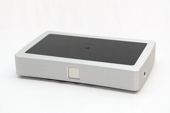 EXOGALの第一弾のモデルが「Comet Computer DAC」である。コーナーがラウンドしたA4サイズほどの大きさで、アルミケースが美しいフォルムを呈している。操作スイッチ類は一切なく、表示パネルのみが中央に据えられている。付属リモコンからの操作に加えて、iPadなどにインストールした操作アプリ「EXOGAL remote」を用いてBluetooth経由で入力切り替えや音量調整を行うことができる。