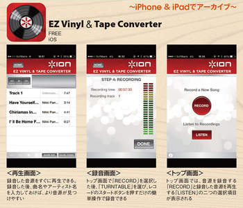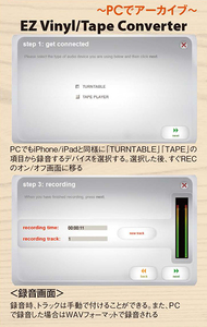 また魅力的なのが録音機能だ。USB 端子(Bタイプ)を装備しており、PCやiPhone/iPad などとつなげて録音できる。PC用ソフトウェア「EZ VInyl/Tape Converter」、iOSアプリ「EZVlnyl & Tape Converter」を使用し、実際にPCやiPhoneで録音操作を行ってみると、その手軽さに驚く。接続デバイスを選択し、録音レベルの調整をした後、すぐに録音開始となる。iOSアプリではMP4、PCではWAV(44.1kHz/16bit)のファイルで録音される。またiPhoneなどで録音する場合はカメラコネクションキットが必要になる。