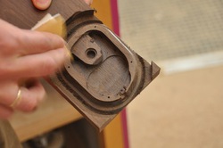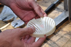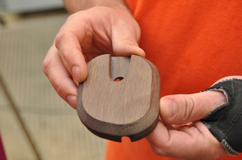 大型の加工機械を使って一枚の“埋もれ木”の板材から左右のハウジングを彫り上げていく。できあがったパーツはひとつずつ手でヤスリをかけながら細部を整える。スタッフによれば「埋もれ木はとても堅い木材なので、一枚板のどこかに節目があるとヒビが入ったり歪みが生じてしまう」のだという。形を整えた後はラッカーで計7回コーティングしていく。コーティングをかける度に木が変形するので、毎度表面をサンドペーパーで平らに磨きながらコートしていく作業の繰り返しだ。ハウジングのパーツを1ペア作るのに約2時間はかかるという、相当な集中力と根気を要する作業だ。