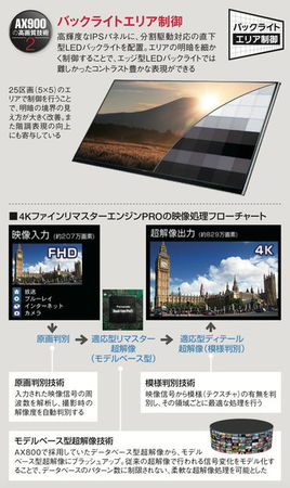高精細表現を引き出す超解像技術は「4KファインリマスターエンジンPRO」に進化を遂げた。新規開発のLSIは変換された映像信号についても原画解像度を判別して適切な処理を行う能力を有し、映像の特徴に応じた精度の高い精細度の復元を行うため、アップコンされた映像にも効果を発揮するという。なお、原画の解像度を判別したうえで絵柄や信号の特徴に応じて最適な超解像を行う機能はAX900シリーズのみの装備で、それが「PRO」と命名された由来である。