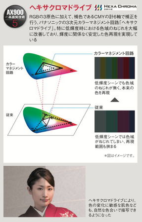 色彩表現については、6軸の色補正を行う「ヘキサクロマドライブ」をAX800シリーズから継承してDCIカバー率約98%を達成したうえで、新たにBT・2020信号の入力時にも色バランスを最適化して鮮やかさを保つ工夫を採り入れ、4K映像の再現力を高めた。広色域の色再現は「カラーリマスター」によってオリジナルに近い色を復元することを実現。ここにもプラズマテレビから継承した技術が活かされている。