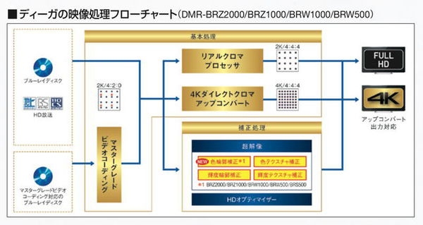 そんな一目置かれるディーガの高画質は「原画忠実」という不変の画質思想を軸に、磨き上げられた独自の信号処理とそれを司るLSIの「ユニフィエ」により支えられている。本機BRW1000はもちろん、同時に発表・発売された兄弟モデルのDMR-BRZ2000/BRZ1000/BRW500にもBZT9600と同じ最新世代のユニフィエが採用され、地デジからBDソフトまで、さまざまなソースをダイレクトに4K化する「4Kダイレクトクロマアップコンバート」を搭載する。