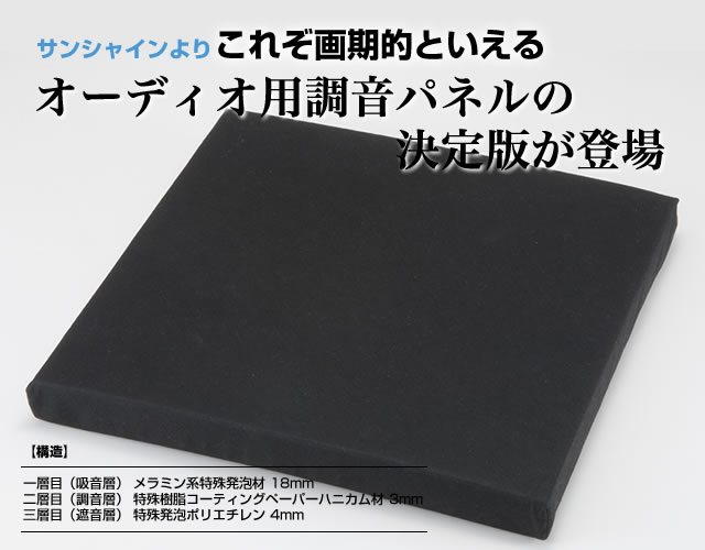 改めて構造をみよう。調音層である3mmの「特殊樹脂コーティングペーパーハニカム材」を、上下の吸音層と遮音層ではさむサンドイッチ構造だ。1層目の吸音層はスポンジ状の「メラミン系特殊発泡材」、遮音層には「特殊ポリエチレン」を用いて、シンプルに仕上げている。