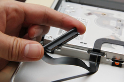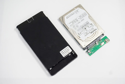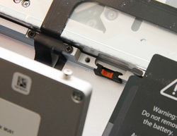 裏面パネルを開けて、コーナーのあたりに2.5インチHDDを発見。続いてこれを外していくわけだが、その前にHDDの側にある黒色のストッパーを、2箇所のネジを緩めて外す。するとHDD本体から出ているベロをつまんでHDDが浮かせるようになる。HDDと本体は1本の平型のSATAケーブルでつながっているので、断線しないよう慎重にこれをピンから外す。