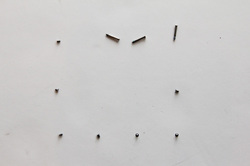 裏面のパネルは四方に全部で10箇所のネジで固定されている。どれも同じプラスドライバーで外せるが、うち3本だけ長さが違っていて、そもそも他のネジもすごく小さい。作業中に紛失しないよう、外してすぐに白い紙の上に本体に装着されていたままの配置で並べておいたので、後で戻す時にとても楽だった。