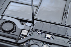 裏面パネルを開けると、中央にスティックタイプのSSDがあるので、こちらを固定しているプラスのネジをドライバーで外す。そこにSSDを新たに付け替えるだけと手順はとても簡単。パネルを元に戻して手作業の部分は完了した。