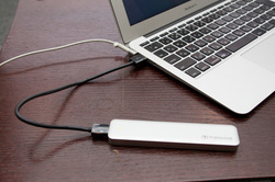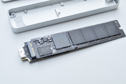 MacBook Airに付属するUSBメモリータイプのインストーラーをMacに装着して、キーボードの「C」を押しながら本体を起動。手順に従ってMac OSをインストールしていく。OSのインストールが完了したら、ソフトウェアアップデートでOSを最新のバージョンに上げておく。その後、JetDriveのパッケージに付属するケースに元のSSDを入れて、USBケーブルでMac本体につないでUSBから起動。移行アシスタントを使ってシステムを新しいSSDに移してコピー作業も一通り無事に済んだ。