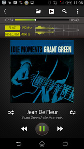 「視覚化」のポイントは、再生中音源と接続機器のステータスが一発でわかる「ハイレゾビジュアライザー」を搭載したところだ。音楽再生時のGUIはジャケット写真やコントローラーが視覚的に美しく配置されているだけでなく、上部に再生楽曲のサンプリングレートとビット数、送り出し先のDACが受けているステータスがメーターで表示される仕組みになっている。たとえば192kHz/24bitの音源を再生した際、それがそのまま再生されているのか、それともダウンコンバートされて再生されているのか分かりやすく確認できるAndroidアプリはなかった。「Ne PLAYER」であれば、それを一目で確認できるというわけだ。