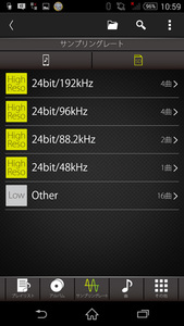 「リスト化」はハイレゾのアーカイブをとにかく探しやすくしてくれる機能を指す。サンプリングレートから楽曲を選べる機能はユニーク。リストから「24bit/96kHz」と書かれた部分をタップすると、合致する楽曲が一覧表示されるので、同じ楽曲でも形式が違うファイルを聴き比べたいときに重宝するだろう。また、WAV/FLACなど「フォーマット」を基準にライブラリから素早く聴きたい楽曲を見つけることができる。