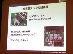 DAC部には据え置き型USB-DACとして人気の高いUD-501や同社のレコーディング機器向けブランド、タスカムのDSDマスターレコーダーDA-3000にも採用されているバーブラウンPCM1795を搭載し、最大192kHz/24bit・PCM&5.6MHz・DSDに対応。マスタークロックも44.1kHz系と48kHz系の高精度水晶発振器を2基備え、正確なD/A変換に役立てている。