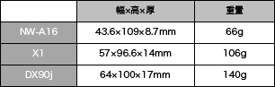 NW-A16は最大外形寸法と外形寸法の両方の表記があるが、どちらにも大きな差はない。表中の数値は後者(「約」は省略)