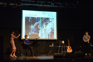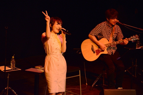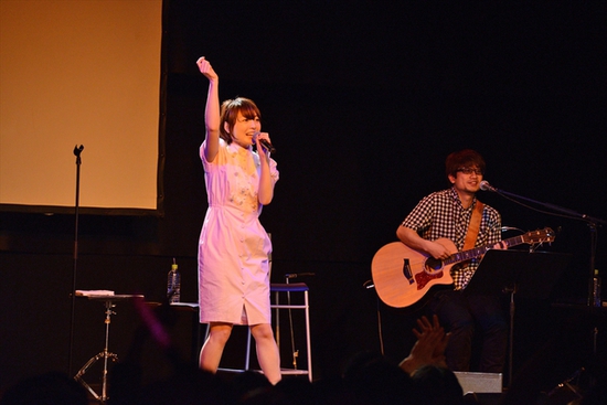 イベントは1時間半を超える盛りだくさんの内容で、ライブコーナーではサウンドプロデューサーである北川勝利(ROUND TABLE)によるギターと、花澤香菜のソロライブでもバンドメンバーを務めている末永華子によるピアノの演奏をバックに、ニューシングル「君がいなくちゃだめなんだ」からの楽曲のみならず、過去のレパートリーもたっぷりと披露。さらには、4月22日に発売される3rdアルバム「Blue Avenue」に収録される新曲「I ♥ New Day」「We Are So in LOVE」「Night And Day」も一足早くアコースティックアレンジで披露するなどファン必見のイベントになりました。