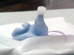 さて、耳穴に無事にOKが出ると、担当の方はさっそくインプレッション準備を開始。ものすごい紫色をしたグネグネの物体をこねはじめた。ほんとにアレを耳に入れるのかしらと若干ビビっていたら、白い発砲スチロールでできた1cm四方のブロックを渡されて、「インプレッション中はこれを口で噛んでて下さい」とのこと。何かというと、耳穴の形状というのは口の動きと連動して変化するので、カスタムIEMをピッタリに作りすぎると口が開けられない状態になる恐れがある。そこで、このブロックを噛んで口を少し開いた状態でインプレッションを行うらしい。