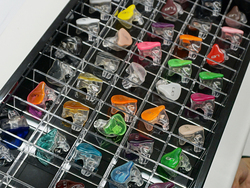 さて、あとはこの耳型を先ほどのe☆イヤホンに持っていけばOK! 話は前後するが、e☆イヤホンカスタムIEM専門店では耳型の持ち込みも受け付けているのだ。続いて、ケーブルの色やフェイスプレートの色を選ぶのだが、この作業もカスタムIEM作りの楽しいところ。私はお店にある見本を実際に自分の耳にはめて、確認しながら色を選ばせてもらった。