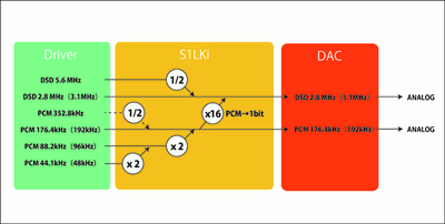 まずは両モデル共通で最大の特徴、オーディオエンジン「S1LKi」から説明しよう。S1LKiは入力されてきたPCMデータを整数倍の176.4または192kHzにアップサンプリングし、さらに2.8/3.1MHz 1bit(DSD)データに変換した上でD/A変換を行うというローランド独自の変換技術。もちろんDSDネイティブ再生にも対応する(5.6MHz DSDの場合は、2.8MHzにダウンコンバート)。