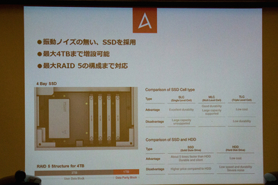 バッテリー駆動によるノイズ混入の根絶に加えて、このS/Nの高さを支えているのがSSDの採用だろう。受注生産モデルのAK500Nは、内蔵SSDの容量を1TB/2TBから選ぶことができる(4TBも今後ラインナップに追加予定)。堀氏は「SSDを採用したことで、AK500Nは再生する際に一切回転系を持ちません。よって余計な共振を限りなく排除できます。この点も音質、特にS/Nの高さに当然寄与しています」と説明してくれた。なお、SSDの容量は購入後に追加することも可能。RAIDを組むこともできるという。