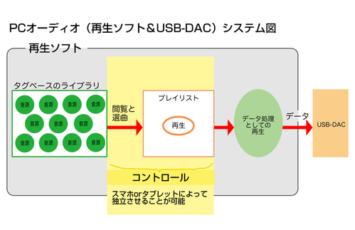 理解を深めるための比較対象として、ライブラリ統合型の再生ソフトとUSB-DACを用いたPCオーディオのシステムを下図に示します。