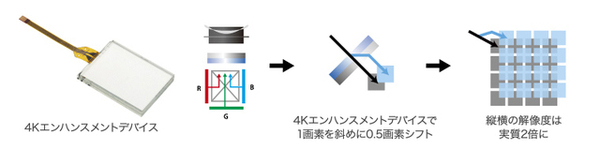 本機の重要ポイントは2つ。第一はLCOS方式で4K解像度を達成したことだ。国内で3社目になる。JVC同様、ネイティブ4Kパネルを採用せず画素ずらしで4,096×2,160相当の解像度で映像を表示する。なお、セイコーエプソンではネイティブ4K LCOSデバイスの試作に成功しており、本機の開発に際して検討と議論が重ねられたものと推察される。
