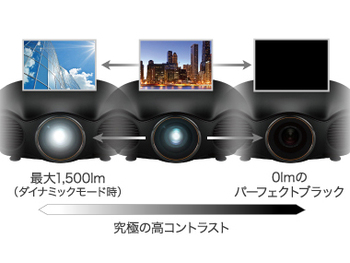 本機のレーザー光源は、輝度信号の入らないフレームを検知すると完全に消灯する。0lm(ルーメンホワイト)、つまり完全な黒の再現が可能になった。エプソンではこれを「パーフェクトブラック」と呼称し、“コントラスト比が無限”とアピールしている。動特性、つまり消灯状態からの復帰も俊敏で、映像の遅れがない。