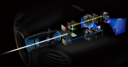 本機の2つ目のポイントに、LCOS方式として初めて、光源にUHPやキセノン等の電球(放電灯)でなく、電子光源(レーザーダイオード)を使った点が挙げられる。エプソンがずっと手掛けて来た3LCD(透過型液晶)は高輝度が得られやすく生産性に優れる反面、開口率の狭さ故にコントラストでLCOSに劣る。また、カラーフィルターを用いるために色域の広さでも遅れを取っていた。それを挽回するために光学機器メーカーとしての技術を活かし、ディープブラックテクノロジーやシネマフィルターを開発し戦ってきたわけだが、今回LCOSを採用したことでこのビハインドが消えた。むしろ、逆にこれまで培った技術をLCOSに応用することで他社へのアヘッドを生み出すことが出来る。そうしてレーザー光源が採用された。