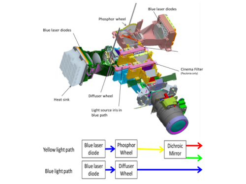1つは、色再現に最適波長の青の純度が高いブルーレーザーで拡散ホイールを併用してBの光源に使用する。もう1つは、効率に優れた波長を異にするブルーレーザーで蛍光体ホイールを使ってYに変換した後にダイクロイックミラーでRとGに分光し、最終的にBとあわせ込んで映像を構成する。波長を異にした二種の青色レーザーダイオードを使用することで色域は飛躍的に拡大し、DCIやアドビRGB領域をクリアした。広色域を活かして本機のカラーモードは10種に分化した(カラーモードの種類:ダイナミック、リビング、ナチュラル、THX、シネマ、デジタルシネマ、AdobeRGB、3Dダイナミック、3Dシネマ)。