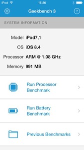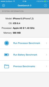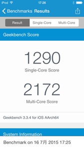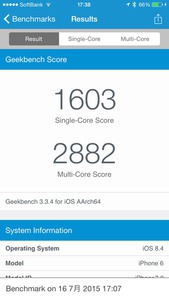 Geekbenchのスコアでは、iPhone 6はシングルコアのスコアが1603、マルチコアのスコアが2882という結果に。対するiPod touchのスコアはというと、シングルコアが1290、マルチコアが2172。ほぼクロック周波数と比例する結果となった。