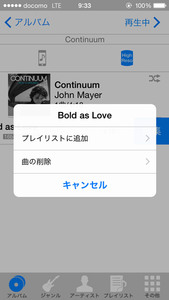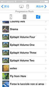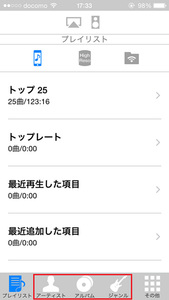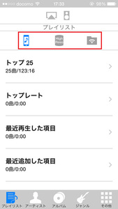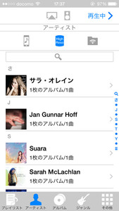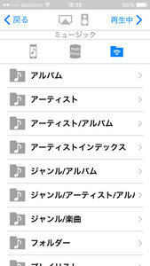 端末に音源を転送したところで、Ne PLAYERを起動する。ここからはiPhone版を軸に画面を紹介していく。Ne PLAYERの起動後、まず確認すべきなのは画面上部の3つのアイコンだ。これらのアイコンは現在選択しているライブラリを示し、左から「ミュージックのライブラリ」「Ne PLAYERのライブラリ」「ネットワーク上のライブラリ」となっている。ライブラリを選択した後は、画面下部のアイコンから選曲を行う。