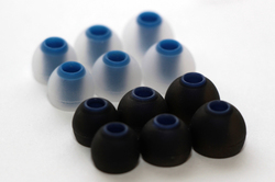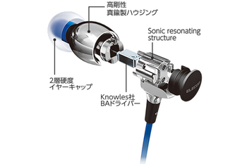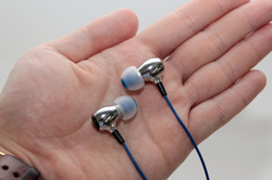 イヤーピースはブルーの軸の部分と、耳に接する半透明な傘の部分とで2つの異なる硬さを持たせた構造になっている。音質に与える効果としては密閉性が高まることによって、BA型シングルドライバー構成のイヤホンの課題とも言われる「低音域の再現性」をアップさせることにつながっているという。