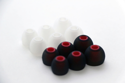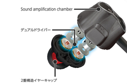 イヤーキャップは傘にあたる部分とユニットとの装着軸部で2層構造となっている。硬度を変えた2層シリコンで成型された構造により、遮音性にも優れて低音再現性も高めている。