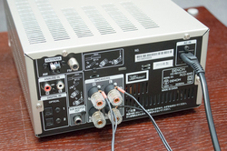 「RCD-M40」の実機を前にしてみると、コンパクトな金属筐体のオーディオ然とした作りの良さに納得。さらに背面を見ると、スピーカー端子はバナナプラグ対応のスクリュータイプで金メッキ仕様。ここにもミニコンポらしからぬHi-Fi指向が伺える。もうひとつ、細かなポイントだが本機の電源ケーブルはメガネ型の着脱式だ。電源ケーブル交換によってさらに音質を高められることにも心くすぐられる。